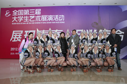来自云南代表团《木屐舞》的云南艺术学院文华学院的同学们,身着哈尼族灿烂独特的银饰服装,短衣短裤,赤脚的木屐在台上欢快、尽情地跳着、舞着、唱着…,强劲的节奏使姑娘们沉浸在歌的海洋,舞的欢乐之中。每个节目彩排结束,组委会都会将演出人员带到正门大厅拍张合影留念。