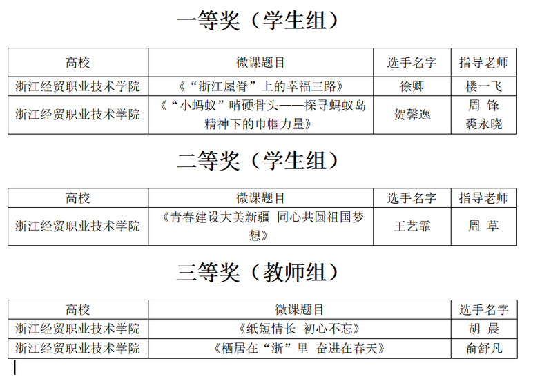 近日,2023年浙江省高校思政微课大赛在浙大宁波理工学院落下帷幕。我校6位师生参加本次大赛,经过复赛、决赛、总决赛三个环节的激烈比拼,共获一等奖2项,二等奖1项,三等奖2项。