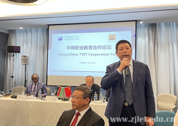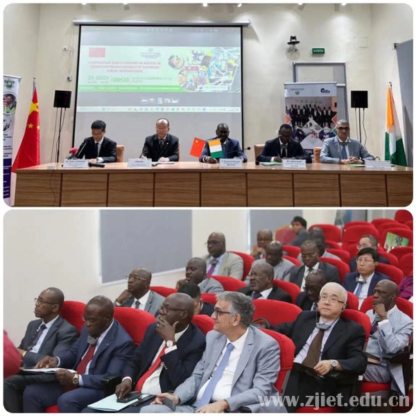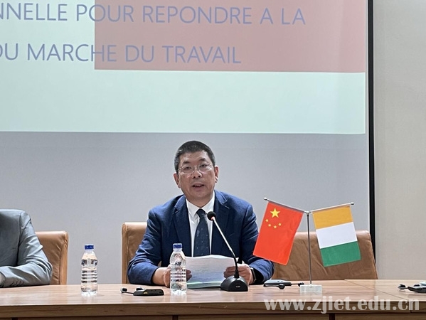 在科特迪瓦期间,代表团一行参加了由中国教育国际交流协会与科特迪瓦职教部共同举办的中科职业教育合作研讨会。陈德泉代表中方院校围绕“建立满足劳动力市场需求的职业培训体系”进行专题发言。他结合我国和浙江省经济社会发展现状,分别对国家职业培训体系、省域职业培训特点进行了介绍,并从产教深度融合、专业迭代升级、强抓师资队伍、强化项目带动等四个方面详细阐述了我校“四位一体”的特色职业技能培训体系。他指出,职业培训体系的构建要充分考虑区域产业链布局和人才需求,建立健全对接产业动态调整和自我迭代完善的具有区域特色的培训机制和工作路径。科方参会领导非常赞同我校的职业技能培训体系,表示希望能学习借鉴中国近年来在职教发展中积累的经验,加强双方师生互访、师资能力提升等项目合作。