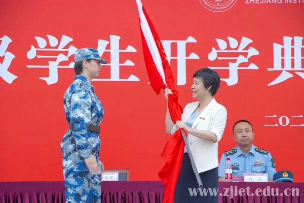 典礼现场,主席台领导为新生代表佩戴校徽,对新生正式成为“经贸人”表示祝贺。