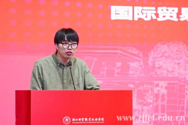 国际贸易学院2013届应用英语专业毕业生季永强作校友代表发言,他分享了在校求学的成长收获以及毕业后的创业经历,表达了对母校的感恩之情与美好祝福,并寄语学弟学妹们秉持母校“厚德崇商”的校训,扎实学好专业知识,建立积极开放的心态,增强社会责任感和使命感,踔厉奋发、勇毅前行,开创美好未来。
