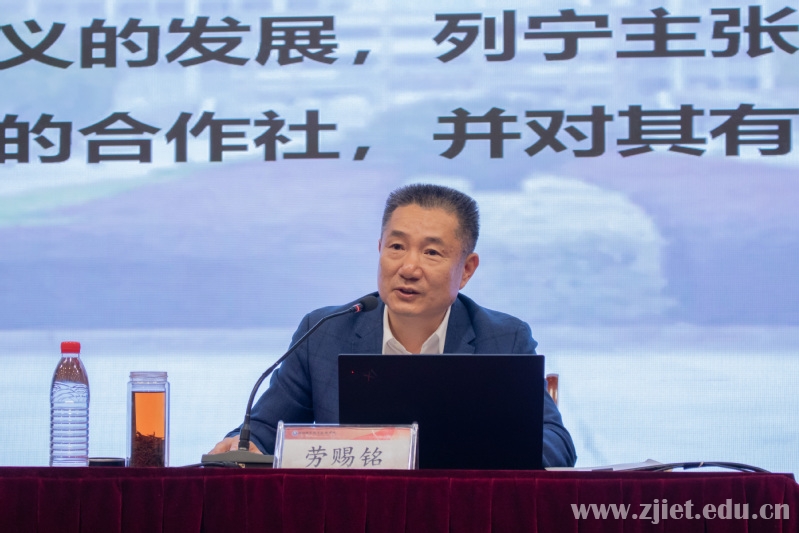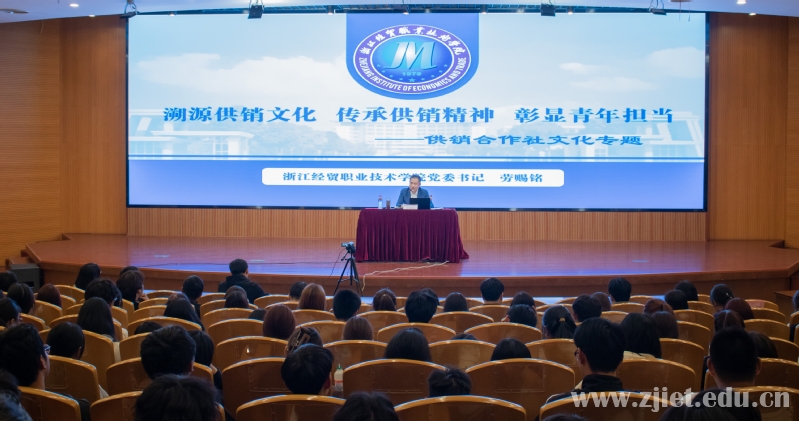 劳赐铭结合学习宣传贯彻习近平总书记关于供销合作社事业发展的系列指示、批示、讲话精神,从供销社历史沿革、改革发展和文化传承三个层面对供销合作社文化的内涵进行详细解读,重点阐述了省供销合作社在实施服务乡村振兴,践行“两山理论”、“八八战略”,打造“重要窗口”等方面的浙江新实践。他还着重举例“南区精神”、“扁担精神”、“背篓精神”以及“新仓经验”等供销合作社文化发展中的典型代表,激励同学们坚定理想信念,厚植为农服务情怀,把“扁担精神”“背篓精神”自觉转化成为生动的爱国之情、强国之志、报国之行,与祖国共奋进,与时代同成长。最后,劳赐铭寄语广大师生,希望广大经贸青年积极参加学习贯彻习近平新时代中国特色社会主义思想主题教育,坚定理想信念,传承优秀文化,坚持目标引领,发扬奋斗精神,创造精彩人生;希望广大教师坚守教育初心,勇担时代使命,立德修身,铸魂育人,当好学生成长的引路人,共同推动学校教育教学事业高质量发展。