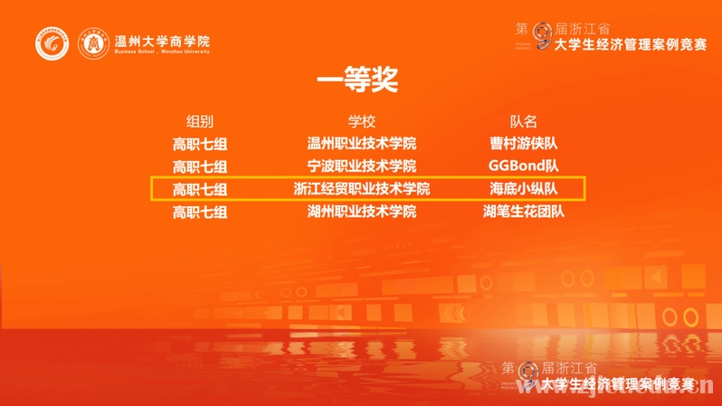 11月5日,由浙江省教育厅主办的第九届浙江省大学生经济管理案例竞赛决赛在温州大学落下帷幕。我校工商管理学院师生团队再传佳讯,在指导老师的悉心指导和参赛选手的努力拼搏下,斩获一等奖1项,二等奖1项,三等奖2项。具体获奖名单如下: