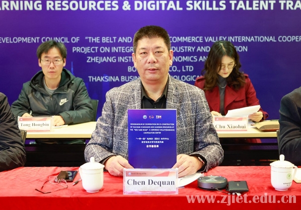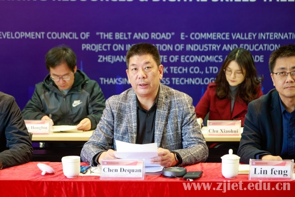 陈德泉在讲话中简要介绍了学校的基本情况、办学特色和国际化办学成果,并回顾了中泰行合作项目和主要成效。他指出,学校将在电商谷产教融合国际合作项目发展理事会的指导下,进一步深化合作内涵,构建合作共赢长效机制,持续增强服务“一带一路”建设的关键能力,提升泰中经济社会发展相关领域的职业技能人才培养水平。