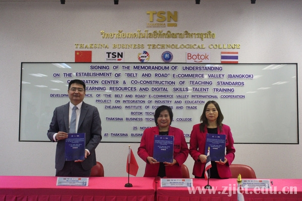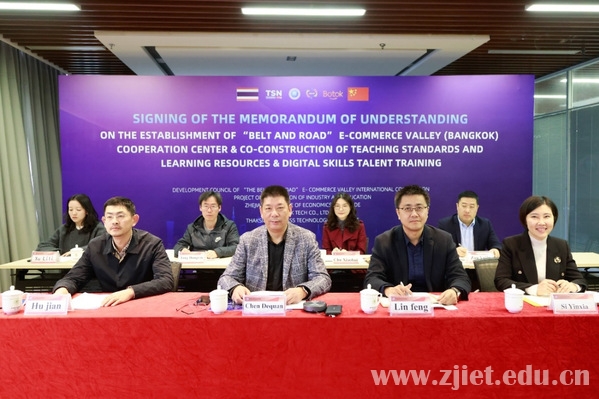学校作为“一带一路”电商谷(曼谷)国际合作中心的国内主要参建院校,与泰国塔克西纳商务管理技术学院签署电子商务领域教学标准与学习资源共建协议。